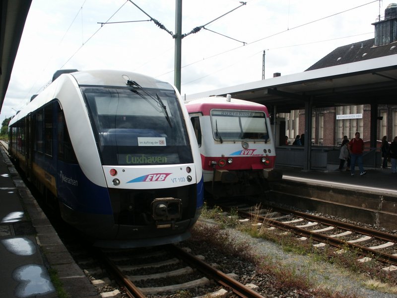 2 EVB-Triebwagen in Bremerhaven Hbf. Der LINT fuhr nach Cuxhaven und der 628er nach Buxtehude. Aufgenommen am 16.07.08
