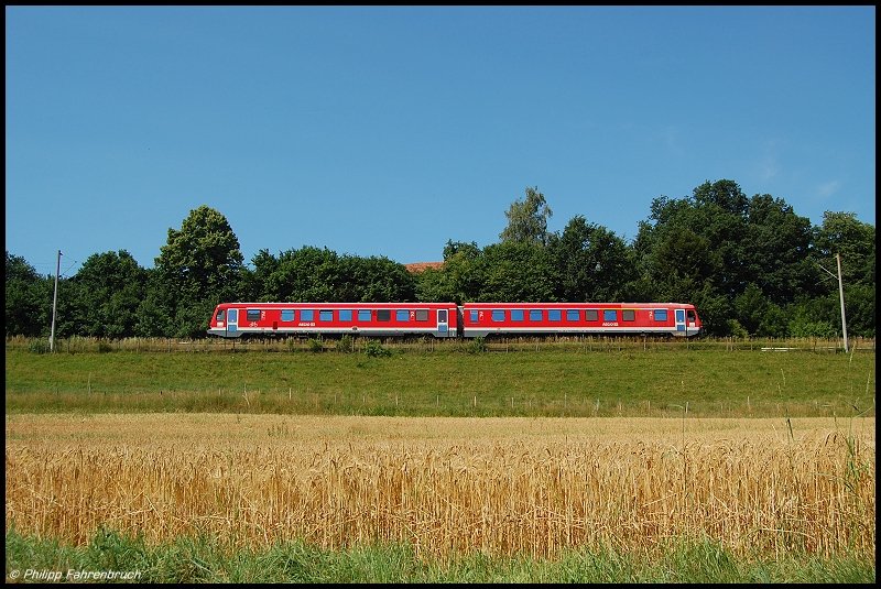Ein 628er ist am Nachmittag des 02.07.08 unterwegs als RE 22532 von Ulm Hbf nach Crailsheim, aufgenommen zwischen Königsbronn und Oberkochen an der Brenzbahn (KBS 757).