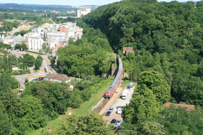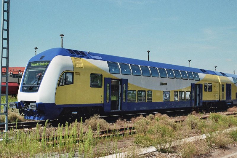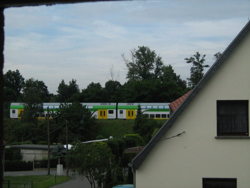 Blick am 18.07.2008 aus meinem Bürofenster, Testfahrt Bombardier mit Doppelstockwagen für Polen