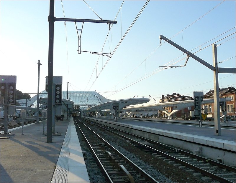 Das Abendlicht des 28.06.08 erhellt das gläserne Dach des Bahnhofs Liège Guillemins. Rechts stehen schon die neuen Fahrleitungsmasten, während links noch die alten zu sehen sind. (Jeanny)