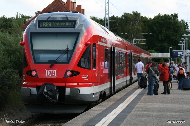 Der RE9 aus Rostock ist gerade im Bahnhof Ostseebad Binz eingefahren und fährt in kürze zurück nach Rostock.