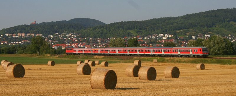 Zwei 650er sind am Morgen des 05.07.08 unterwegs als RE 22523 von Crailsheim nach Ulm Hbf, aufgenommen bei Rainau-Schwabsberg an der Oberen Jagsttalbahn (KBS 786).