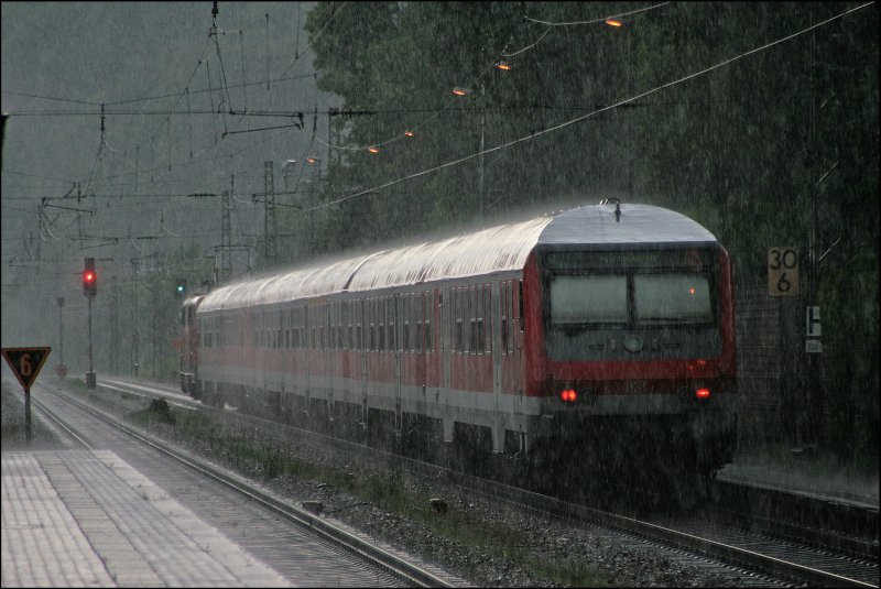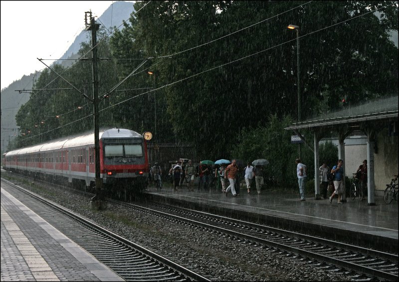 ....Kaum ist der RE 30105 zum stehen gekommen, fängt es schon an zu regnen. Die Fahrgäste laufen zum Ausgang. Kiefersfelden am Abend des 03.07.2008.