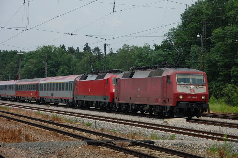 Und noch ein Pärchen in verschiedenen Lackierungsvarianten: 2x Baureihe 120, die sich vor dem EC 60 nützlich machen. (Neuoffingen, 18.07.2008) .