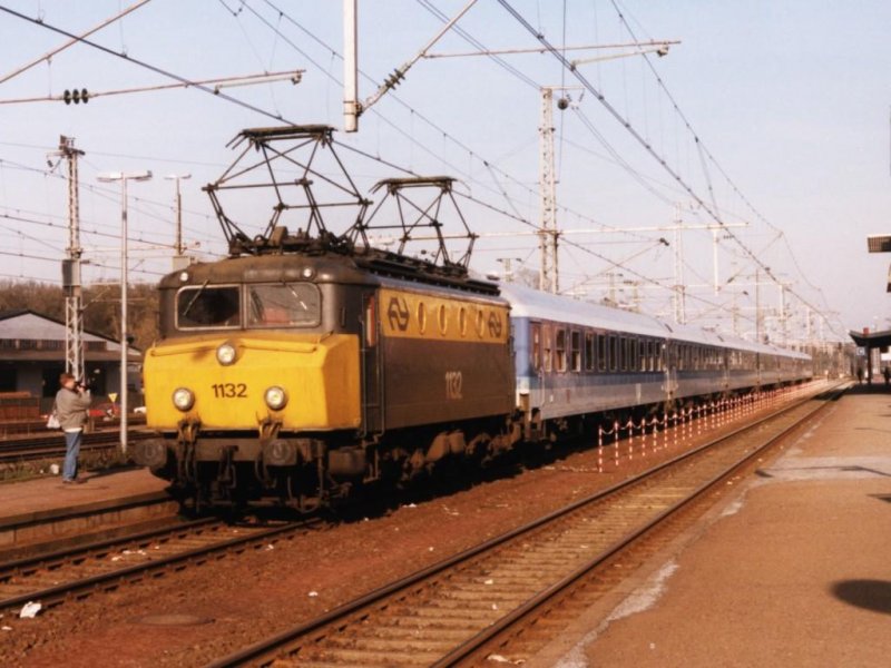 Zehn Jahre zurück (25-3-1998). Letzte Woche war ich in Bad Bentheim und gab es die 1770 mit IC-zug nach Amsterdam. Auf diesen Bild gibt es die schöne und alte 1132 mit IR 2342 "Havelsee" Berlin Zoo-Amsterdam CS auf Bahnhof Bentheim. Leider gibt es keine Einsatz von BR 1100 mehr in die Niederlande. Bild und scan: Date Jan de Vries.