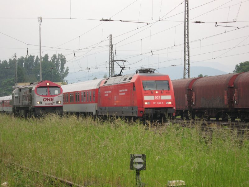 101 072-7 mit EC101 von Hamburg-Altona nach Chur mit +5.Dieser Zug wurde wegen Bauarbeiten über Groß-Gerau umgeleitet.Am 18.07.08 bei der durchfahrt in Lampertheim.