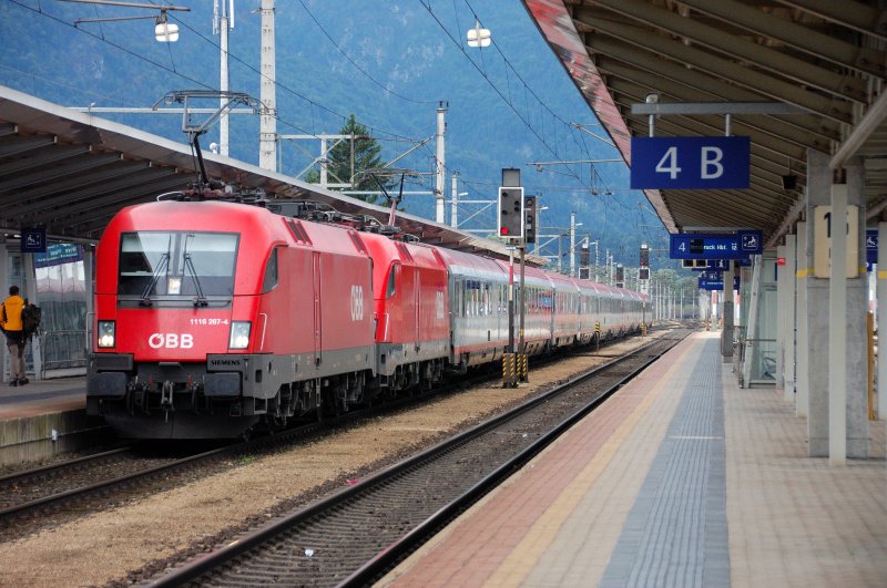 1116 267-4 und Schwester 1116 277-3 bringen den ÖBB-IC "Tiroler Festspiele Erl" nach Wörgl. (20.07.2008)