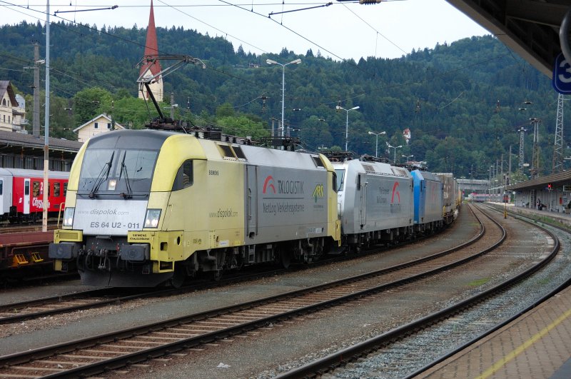 Da isser: Nun hängt er hintendran und schiebt den Trailerzug. ES 64 U2-011 in Wörgl Hbf. (20.07.2008)