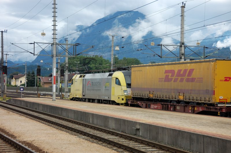 1216 023 (E190 023) erreicht mit einer Rola von Brennersee das Terminal Wörgl Süd. (04.07.2008)