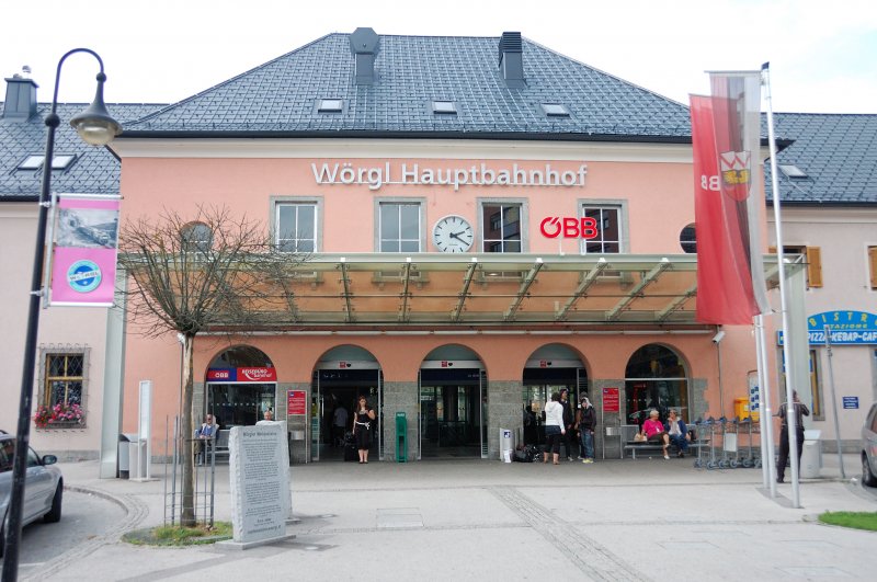 Das wunderschön renovierte und umgebaute Hauptbahnhofsgebäude von Wörgl. Hier der Zentraleingang. (Juli 2008)