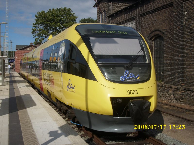 Der OLA-Talenttriebwagen 0005 am 17.07.2008 wartet in Bergen/Rügen auf die letzten Anschlußreisenden um dann nach Lauterbach Mole fahren zu können.