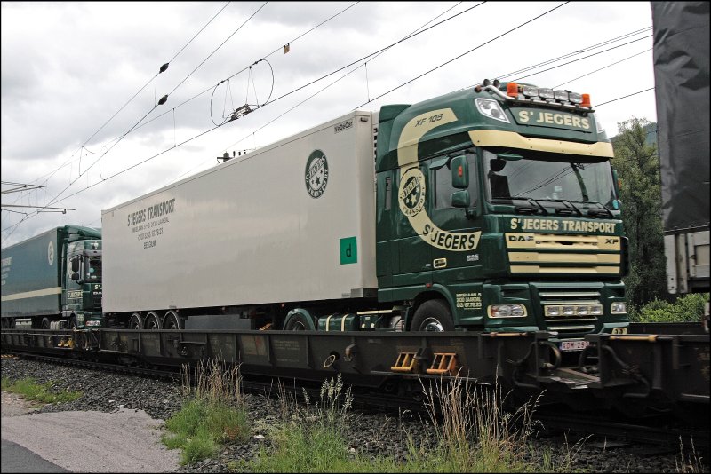 Dieser schöne Belgische DAF XF 105.510 (510 PS) benutzt auf seiner Fahrt von Italien nach Deutschland/Belgien die Rollende Landstraße. Hier bei der Einfahrt in Wörgl Süd. (04.07.2008)