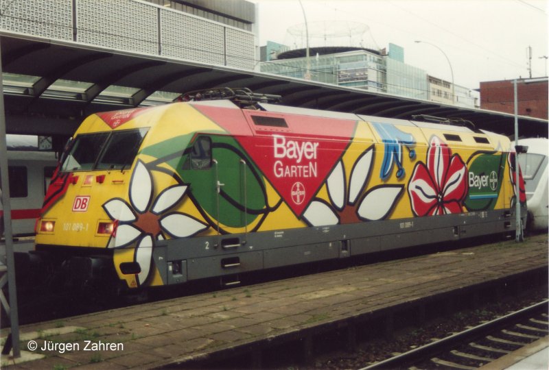 E 101 089-1 mit Werbung "Bayer-Garten" im Mai 2000 in Hamburg-Hauptbahnhof.