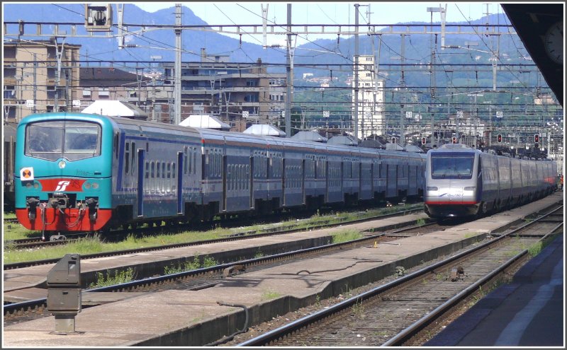 Ein italienischer TILO-Nahverkehrszug mit seinen scheusslichen Klimageräten auf dem Dach neben einem ETR 470 Cisalpino in neuer Bemalung. Chiasso (22.07.2008)