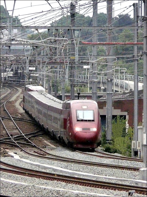 Ein Thalys PBKA mit Antenne für Internetzugang kommt den "plan incliné" aus Richtung Ans herunter und befährt den neuen Gleisabschnitt vor dem Bahnhof Liège Guillemins am 28.06.08. (Jeanny)