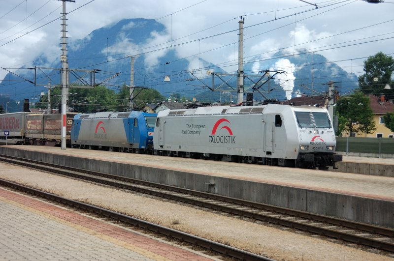 Nanu, die kommen einem doch bekannt vor: 185 537-8 und 185 510-5 vor dem Trailerzug aus Kufstein. Aber wo ist der "ARS"-Taurus? Wörgl, 20.07.2008 .