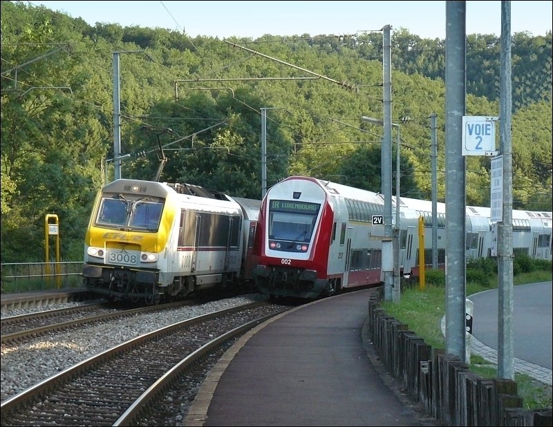 Zugbegegnung an der Haltestelle Drauffelt am 13.07.08. Während der Wendezug soeben in Richtung Luxemburg ausfährt, kommt E-Lok 3008 in Drauffelt an, um nach kurzem Halt, seine Fahrt nach Lüttich fortzusetzen. (Hans)