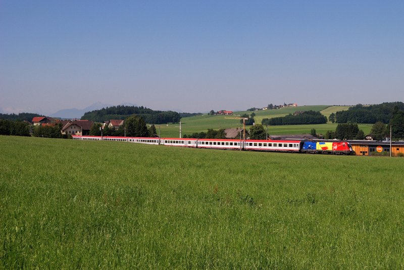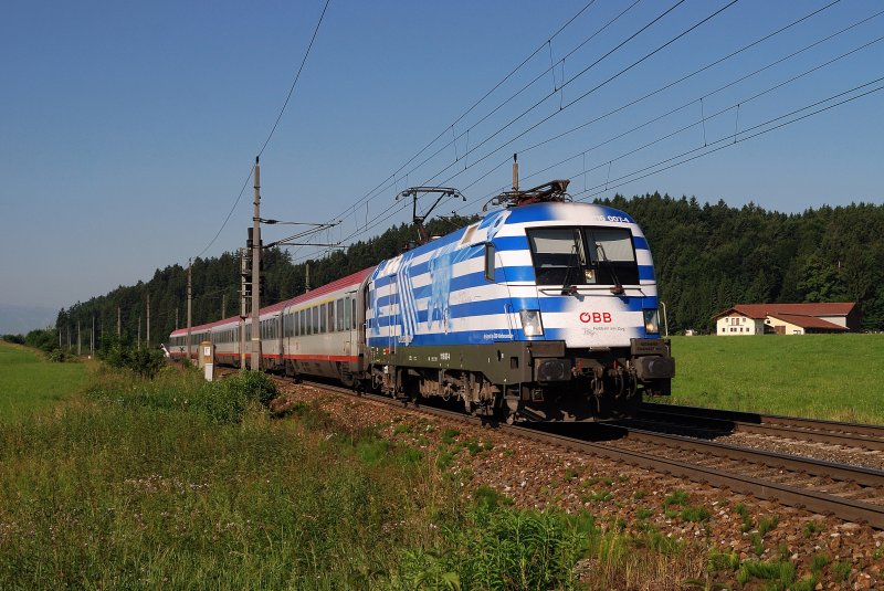 ÖBB-EC 669  Astronomie Jahr 2009  nach Graz steht mit 1016 017-4 abfahrbereit in Wörgl Hbf. (20.07.2008)