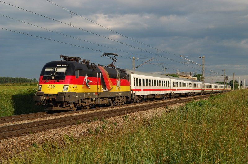 Besseres Licht kann man sich nicht wünschen: 1116 036-3  Deutschland  vor IC 87  Tiepolo  nach Venezia Santa Lucia. (Wörgl, 20.07.2008)