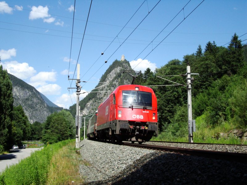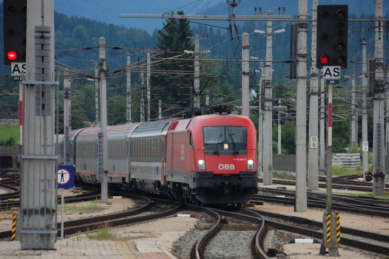1116 221-1 zieht ÖBB-EC 160 "Vorarlberg" in den Bahnhof von Wörgl zur Weiterfahrt nach Zürich. (20.07.2008)