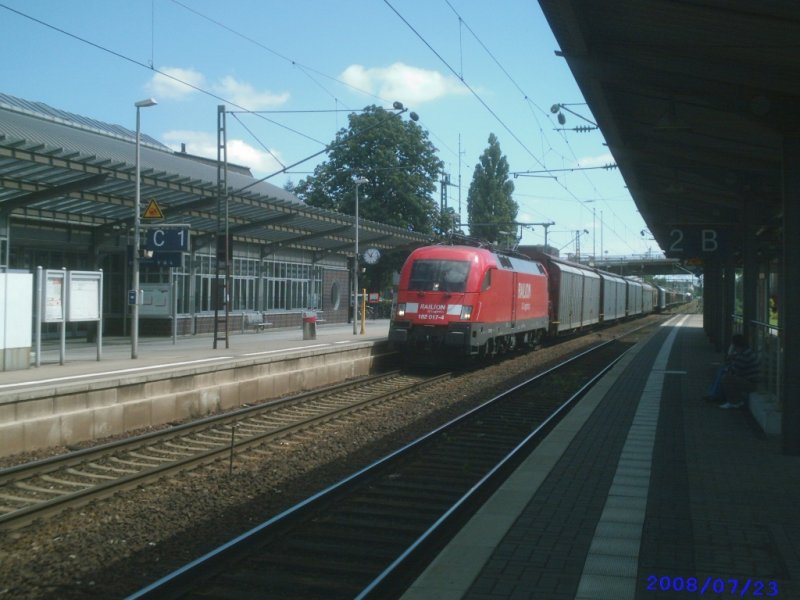 182 017-4 durcheilt mit einem Gz vom VW-Werk Wolfsburg den Bahnhof Peine. 24.07.2008