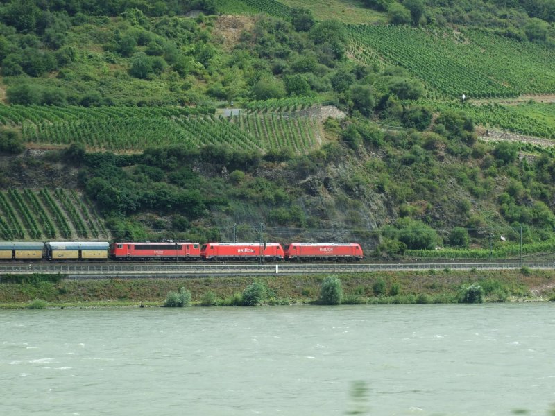 2x 145 und 1x 155 im Spann ziehen einen Güterzug auf der rechten Rheinstrecke Rtg. Rüdesheim. Ort ist leider unbekannt. (aufgenommen zwischen Koblenz und Rüdesheim) Datum: 22.7.08