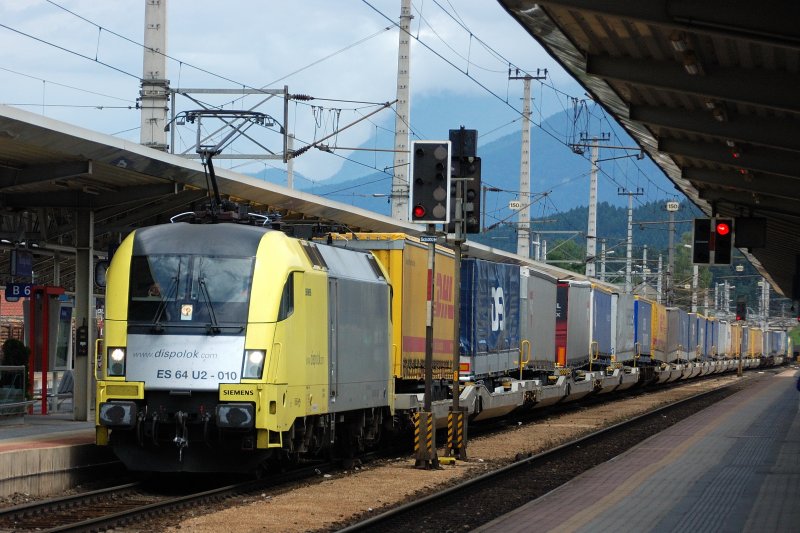 Auf gehts Richtung Italien: ES 64 U2-010 legt sich mit ihrem Trailerzug mächtig ins Zeug. Ganz am Ende des Zuges drückt ein weiterer Dispo-Taurus nach. (Wörgl, 20.07.2008)