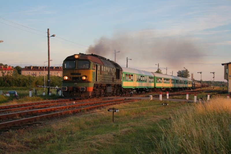 Den Bahnhof von Orzysz verlässt ST44-543 am 29.06.2007 mit einem Millitärzug.