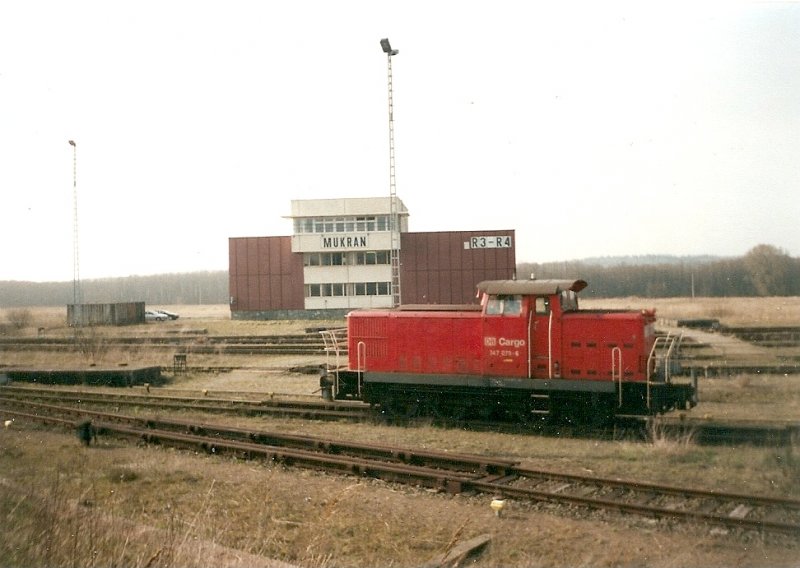 Die 347 079 im Mai 2001 vor dem Breitspurstellwerk in Mukran.
