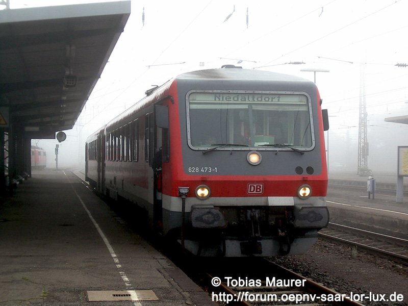 Frühjahr 2007: Der VT 628 473-1 steht abfahrbereit im Bahnhof Dillingen (Saar). Er fährt als RB nach Niedaltdorf.