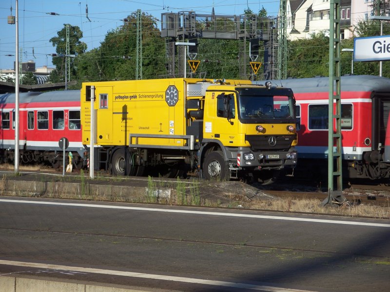 Messfahrzeug eines privat Unternehmens, basis ist ein Atego LKW mit Schienenradsätzen und Antrieb über die Hinterachse auf Rollen zum hinteren Radsatz, eine zusätliche Fahrerkabine ist im Aufbau hinten. Aufgenommen am 23.07.2008 19:49Uhr in Giessen