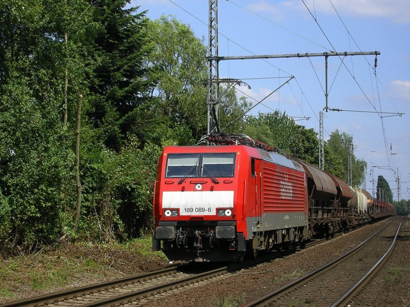 Railion 189 089-6 mit Schotter.-Kessel.- und leeren Autowagen in Richtung Bochum Nord , kurz vor BO Nokia.(24.07.2008)