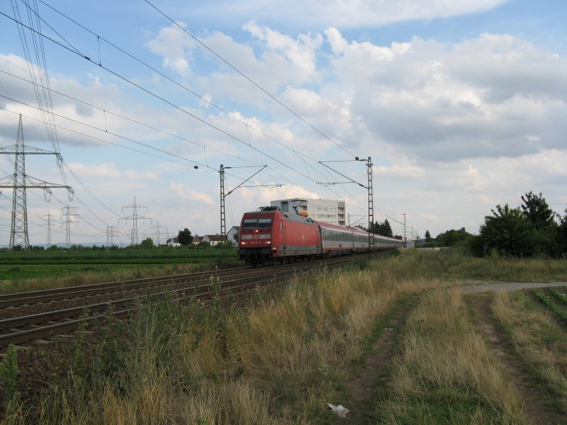 101 111-3 mit EC114 von Klagenfurt Hbf nach Dortmund Hbf.Dieser Zug wurde wegen Bauarbeiten über Groß-Gerau umgeleitet.Am 29.07.08 bei der durchfahrt in Lampertheim.