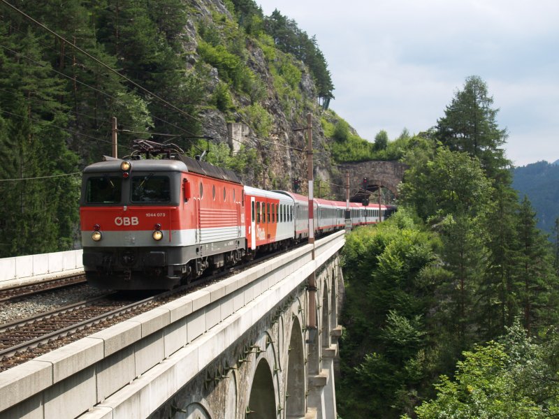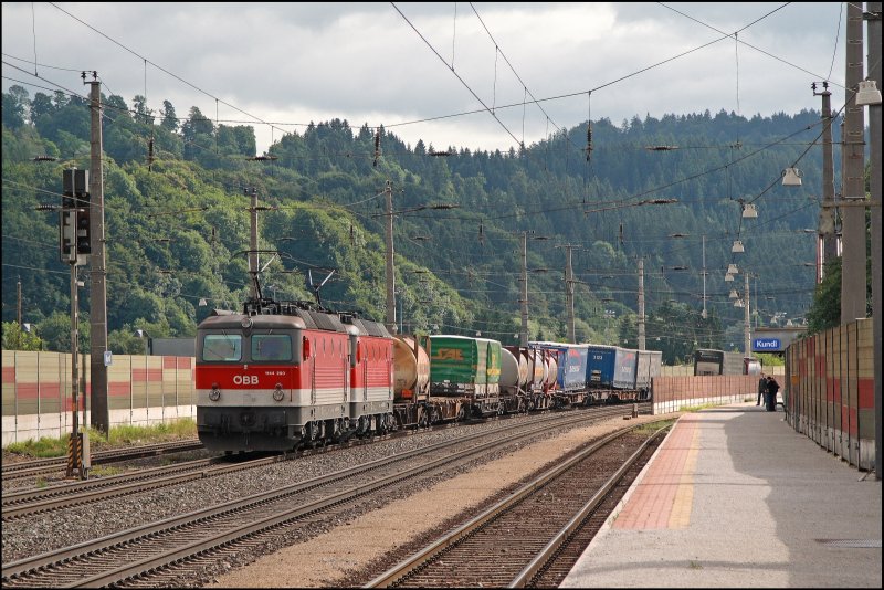 Zwei 1144er kommen und die Sonne kommt hervor: Die Innsbrucker 1144 250 und eine Schwesterlok bringen ohne Hilfe einer Schiebelok einen Kombizug zum Brenner. (04.07.2008)