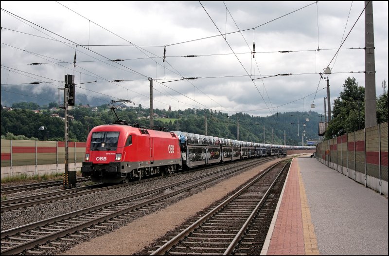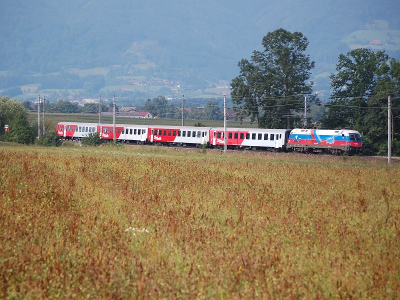 Über Geschmack läßt sich bekanntlich nicht streiten; über das Outfit der neuesten ÖBB-Werbelok noch weniger. Dennoch ist dieses Fahrzeug für jeden Eisenbahnfreund ein Muß. Von Glück kann man sicherlich reden, wenn man die Lokomotive bereits 4 Tage nach ihrer Indienststellung vor die Linse bekommt (29.7.2008).