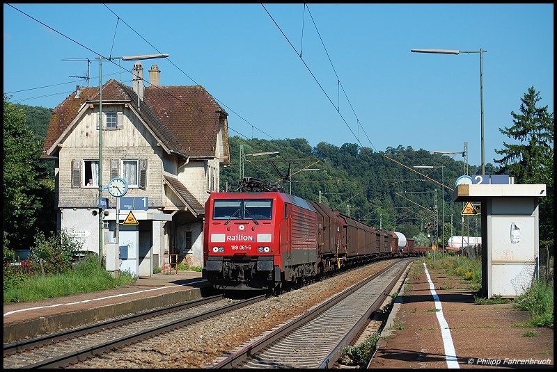 189 061 durchfährt am Morgen des 24.07.08 mit einem gemischten Güterzug Urspring in Richtung Ulm (Filsbahn, KBS 750).