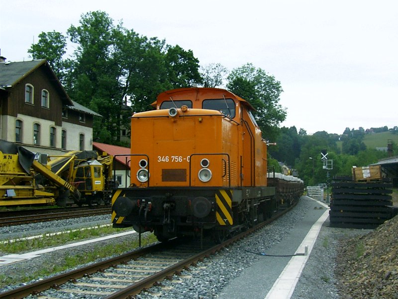 346 756-0 steht im Sommer 2005 im Bahnhof Annaberg-Buchholz Süd. Zu dieser Zeit wurden die noch vorhanden Gleisanlagen erneuert und moderninisiert.
