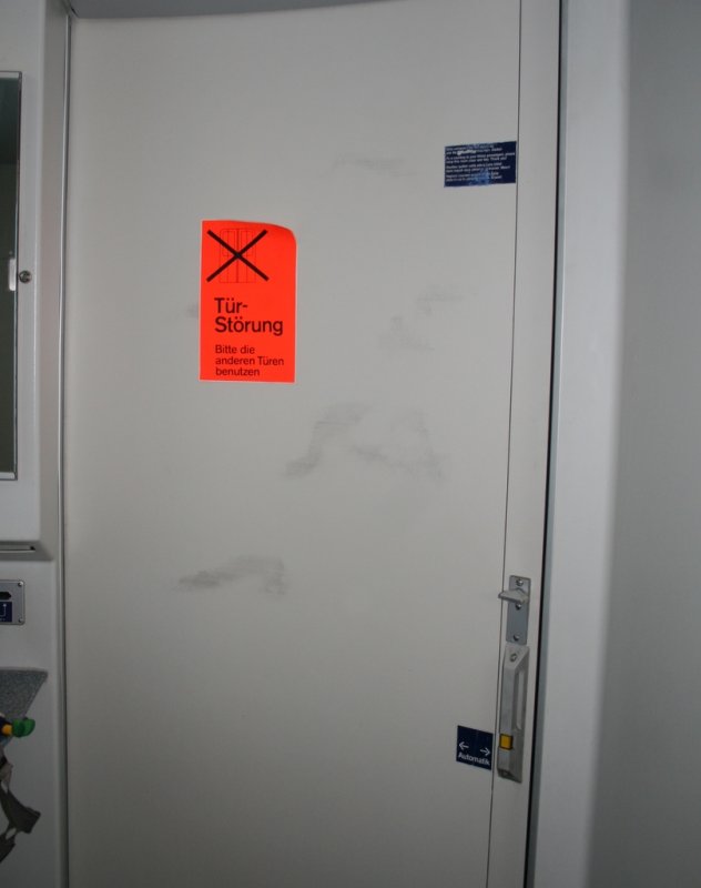 Als ich in einem 425 der S-Bahn Rhein-Neckar auf Toilette wollte, kam ich ohne Probleme rein. Doch als ich wieder raus wollte, leuchtete mich dieses orangene Schild an...