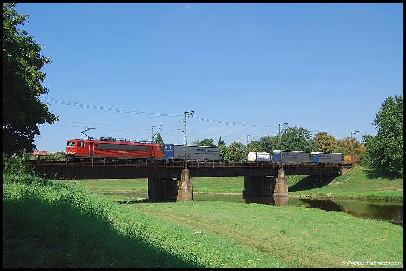 Am Morgen des 25.07.08 passiert eine verkehrsrote 155er mit KLV-Zug die Rastatter Murgbrücke mit Fahrtrichtung Süden (KBS 700).
