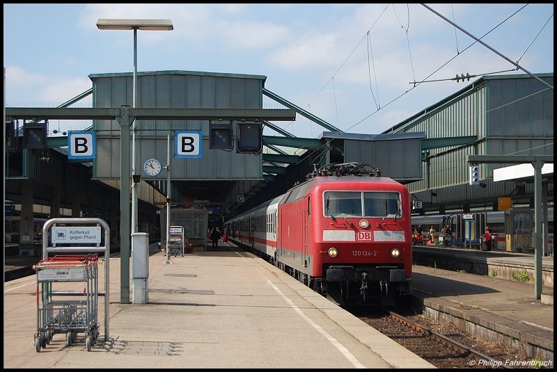 Am Morgen des 25.07.08 steht 120 134 mit IC 2010 nach Berlin Südkreuz auf Gleis 11 des Stuttgarter Hbfs bereit.