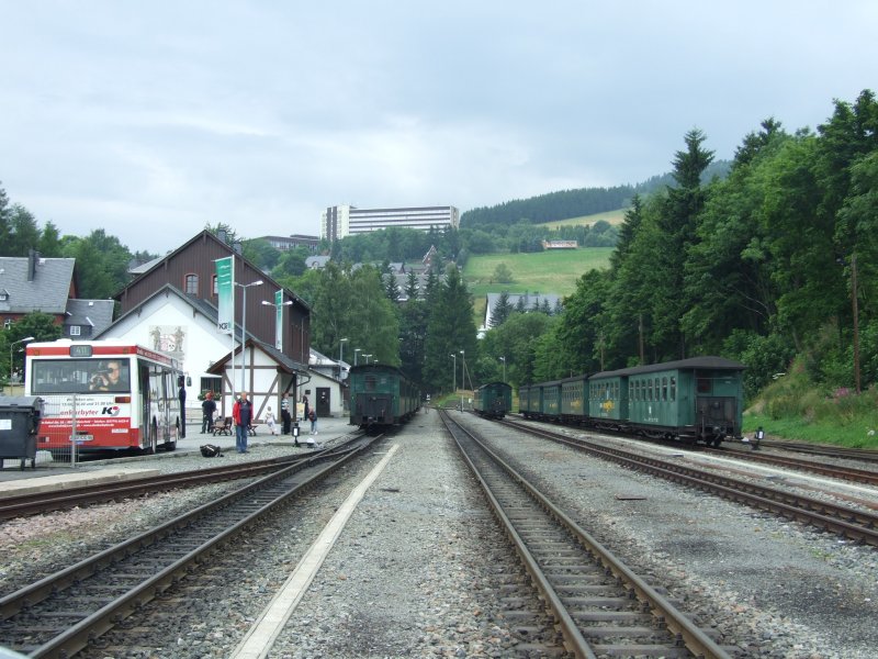 Blick auf den Bf. Oberwiesenthal. Rechts das Bahnhofsgebäude mit ÖPNV-Anschluss, der linke Wagenpark wird gleich zur Rückfahrt nach Cranzahl genutzt, die beiden anderen Züge stehen als Ersatz bzw. zum Mieten zur Verfügung. Im Hintergrund sieht man ein ehemaliges Wohnheim der DDR, Verbleib unbekannt.