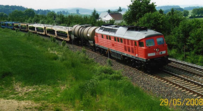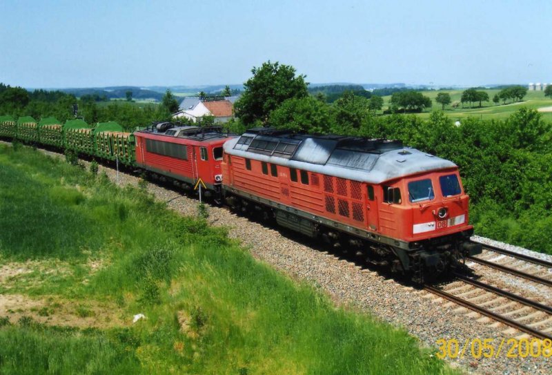 Eine BR 232 377-2 mit einer BR 155 bei wunder schönem Wetter in der steigung vor Herlasgrün am 30.05.2008