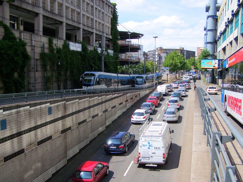 Die Autofahrer stehen im Stau, die Bahnfahrer rauschen daran vorbei: zwei Stadtbahnzüge (links Richtung Kleinblittersdorf, rechts Richtung Siedlerheim) begegnen sich bei der Auf- bzw. Abfahrt der Rampe, die die Haltestellen Trierer Straße und Hauptbahnhof (Stadtbahn) verbindet - im Vordergrund das nördliche Ende des Stadttunnels, der die Haltestelle Hauptbahnhof unterquert (29.07.2008).