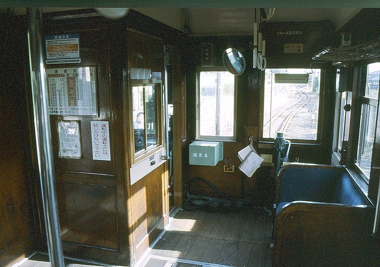 Serie KUMOHA 42: Der Altbauwagen KUMOHA 42 (クモハ42) Nr.001 ist der weitaus älteste bis vor kurzem noch aktive Triebwagen der ehem.Staatsbahn. Gleichstrom, ursprünglich 13 Wagen mit 2 Führerständen, gebaut 1933. (Zur Bezeichnung: HA ハ =hat gewöhnliche Sitzplätze, MO モ =motorisiert, KU ク =Triebwagen od. Bestandteil eines elektr.Triebwagenzugs mit Führerstand.) Suzumeda, 6.Oktober 2001.