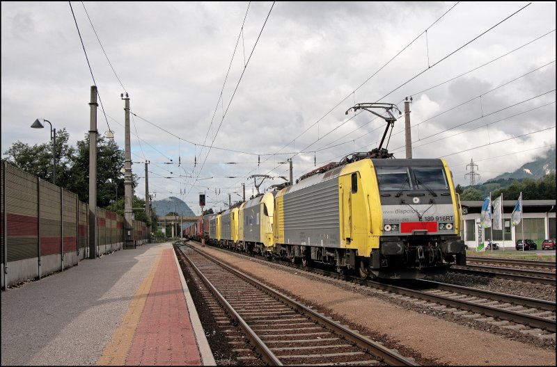E189 916RT, ES64U2 001(?), eine E189er von RTC und die E189 917RT rollen mit einem Kombizug durch den Haltepunkt Kundl Richtung München. (04.07.2008)