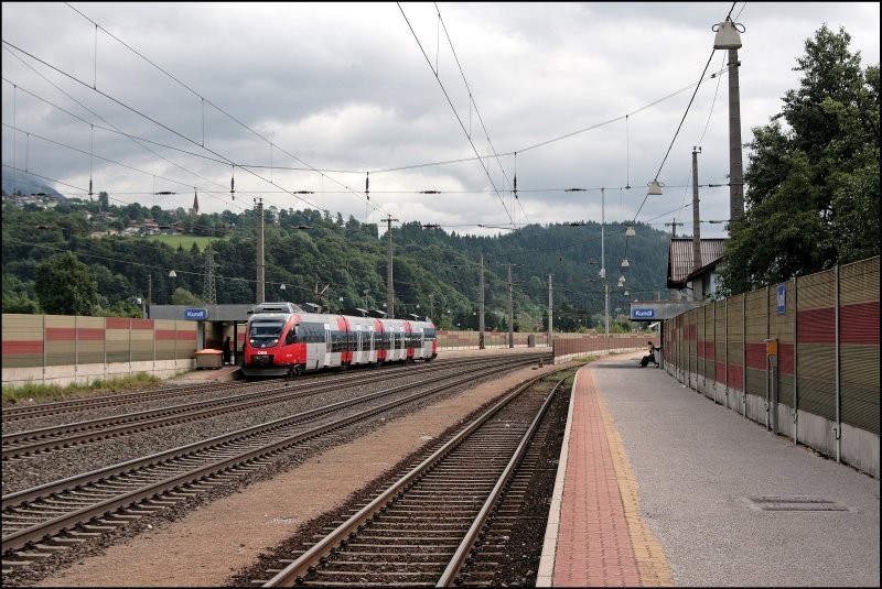 Ein 4024er hat soeben als R 5109 von Rosenheim komment den Haltepunkt Kundl erreicht. Nach kurzem Aufenthalt geht es weiter Richtung Telfs-Pfaffenhofen. (04.07.2008)