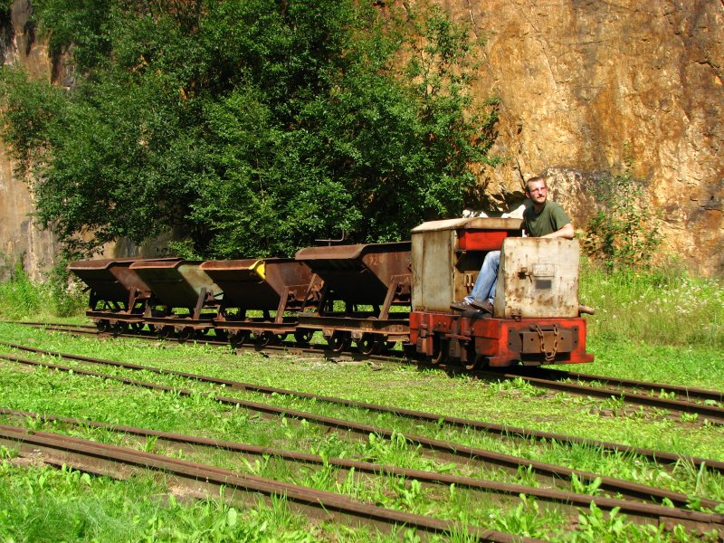 Eine O&K MD1 Diesellok steht mit ihrem Lorenzug im ehemaligen Steinbruch Herrenleite.Das Gelände ist im Besitz der Historischen Feldbahn Dresden.26.07.08