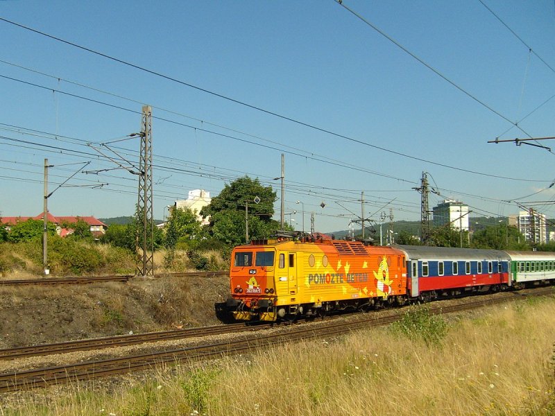 Kuře (das Huhn) (363 084) kommt mit dem Schnellzug 604 Ohre in Chomutov (29.7.08)