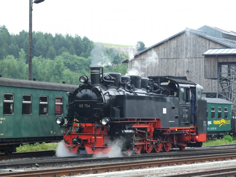 Lok 99-794 der Fichtelbergbahn hat nach Kohle bunkern und Wasser fassen sich auf den Weg gemacht, den Wagenpark auf der anderen Seite des Bahnhofes anzukuppeln. Im Hintergrund stehen ein paar abgestellte Wagen und ebenso zu sehen ist ein Teil des Lokschuppens.