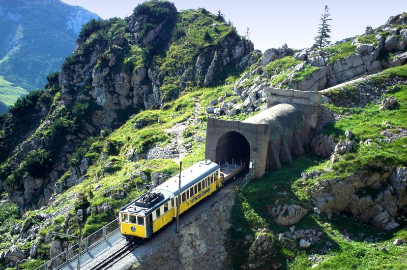 Nostalgiegarnitur der Wendelsteinbahn talwärts fahrend kurz unterhalb des Bergbahnhofes.Die Wendelsteinbahn ist die älteste Hochgebirgsbahn Deutschlands. 28.07.08